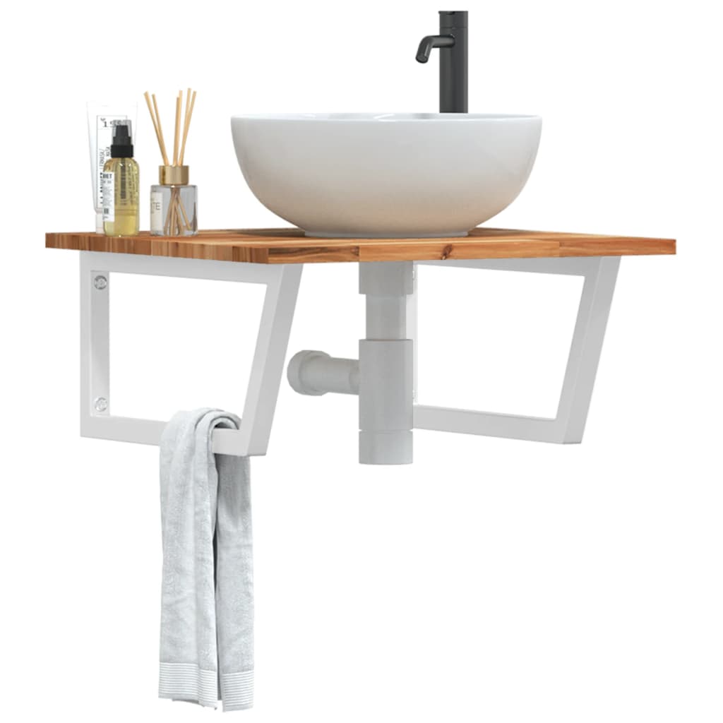El estante de lavabo montado en la pared se fija de forma segura a la pared, proporcionando una solución elegante y que ahorra espacio para tu baño. Robusto y duradero: Este estante de lavabo se combina con una estructura de acero y una tabla de madera de acacia maciza, lo que lo hace robusto, estable y duradero.Ahorro de espacio: El estante de lavabo flotante tiene un amplio espacio para almacenar cremas y artículos pequeños. Gracias a la forma trapezoidal, puedes colgar toallas u otras cosas en el soporte para ahorrar espacio.Fácil de usar: La encimera viene sin perforar para permitir que el lavabo se monte a la izquierda, a la derecha o en el centro, según los requisitos de la habitación. Gracias a los orificios pretaladrados en el soporte, se puede montar fácilmente con el tablero y montar en la pared.Diversos usos: Gracias a su diseño moderno, proporciona espacio adicional para varios tipos de baños. Información útil:Los tornillos no están incluidos, puedes comprar los tornillos por separado según la información que se proporciona a continuación.Fijación a la pared: 2 tornillos de expansión M8 por soporteTabla de madera: 2 tornillos M5x18 (T=2) o 2 tornillos M5x20 (T=2,5/4cm) por soporte