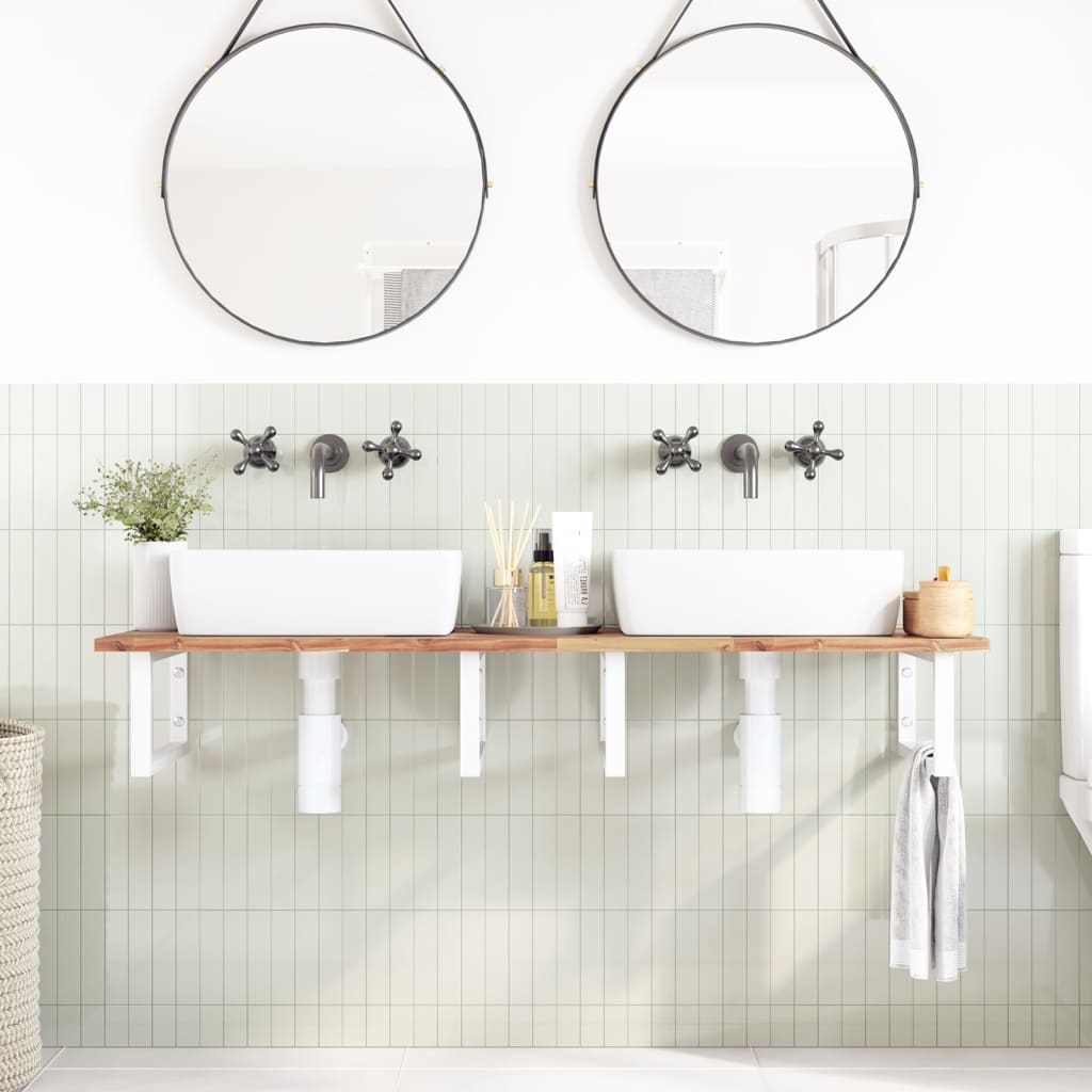 El estante de lavabo montado en la pared se fija de forma segura a la pared, proporcionando una solución elegante y que ahorra espacio para tu baño. Robusto y duradero: Este estante de lavabo se combina con una estructura de acero y una tabla de madera de acacia maciza, lo que lo hace robusto, estable y duradero.Ahorro de espacio: El estante de lavabo flotante tiene un amplio espacio para almacenar cremas y artículos pequeños. Gracias a la forma rectangular, puedes colgar toallas u otras cosas en el soporte para ahorrar espacio.Fácil de usar: La encimera viene sin perforar para permitir que el lavabo se monte a la izquierda, a la derecha o en el centro, según los requisitos de la habitación. Gracias a los orificios pretaladrados en el soporte, se puede montar fácilmente con el tablero y montar en la pared.Diversos usos: Gracias a su diseño moderno, proporciona espacio adicional para varios tipos de baños. Información útil:Los tornillos no están incluidos, puedes comprar los tornillos por separado según la información que se proporciona a continuación.Fijación a la pared: 2 tornillos de expansión M8 por soporteTabla de madera: 2 tornillos M5x18 (T=2) o 2 tornillos M5x20 (T=2,5/4cm) por soporte
