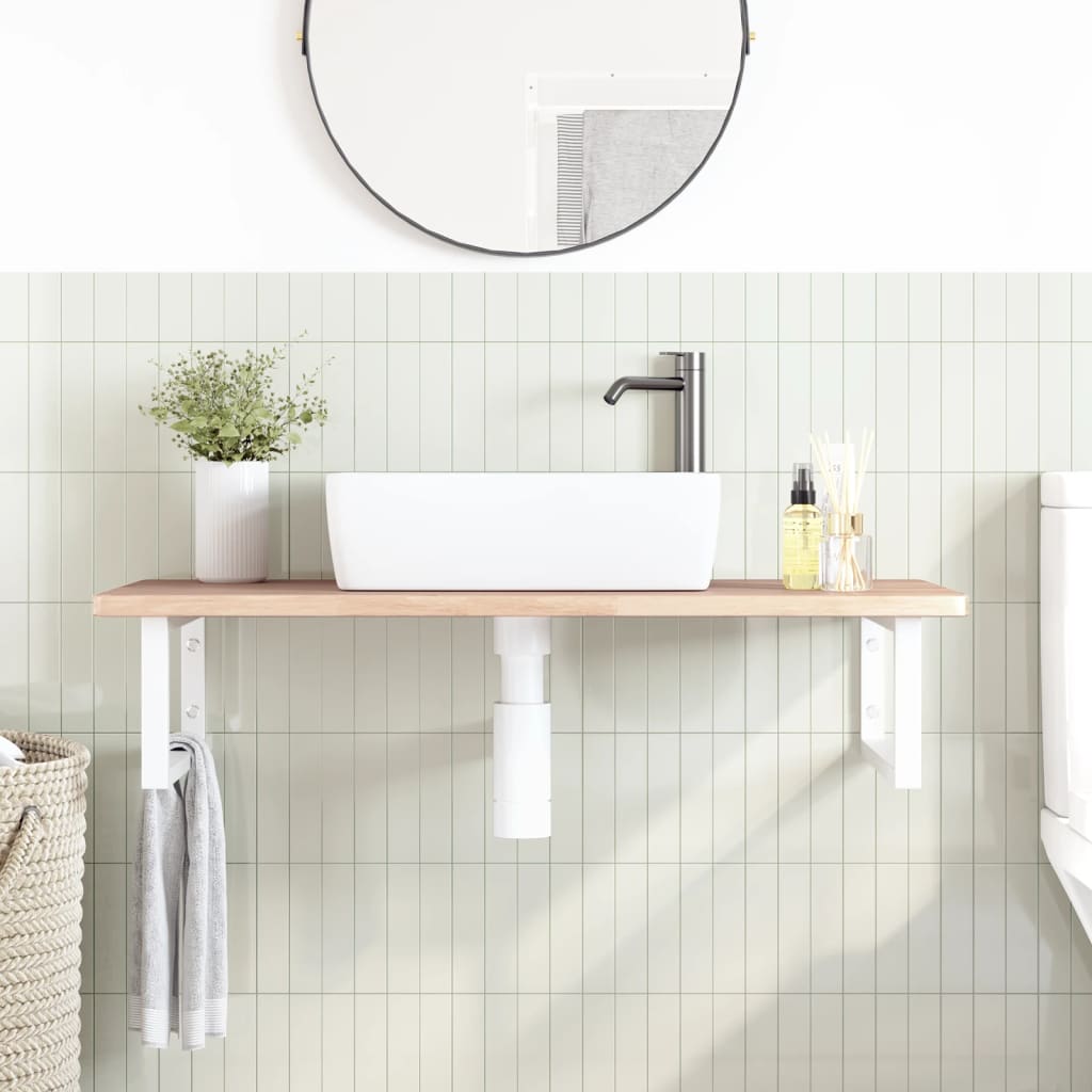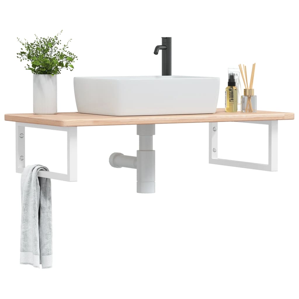 El estante de lavabo montado en la pared se fija de forma segura a la pared, proporcionando una solución elegante y que ahorra espacio para tu baño. Robusto y duradero: Este estante de lavabo se combina con una estructura de acero y una superficie de madera maciza de roble, lo que lo hace resistente, estable y duradero. Ahorro de espacio: El estante de lavabo flotante tiene un amplio espacio para almacenar cremas y artículos pequeños. Gracias a la forma rectangular, puedes colgar toallas u otras cosas en el soporte para ahorrar espacio. Fácil de usar: La encimera viene sin perforar para permitir que el lavabo se monte a la izquierda, a la derecha o en el centro, según los requisitos de la habitación. Gracias a los orificios pretaladrados en el soporte, se puede montar fácilmente con el tablero y montar en la pared. Diversos usos: Gracias a su diseño moderno, proporciona espacio adicional para varios tipos de baños. Información útil:Los tornillos no están incluidos, puedes comprar los tornillos por separado según la información que se proporciona a continuación. Fijación a la pared: 2 tornillos de expansión M8 por soporte Tabla de madera: 2 tornillos M5x18 (T=2) o 2 tornillos M5x20 (T=2,5/4cm) por soporte