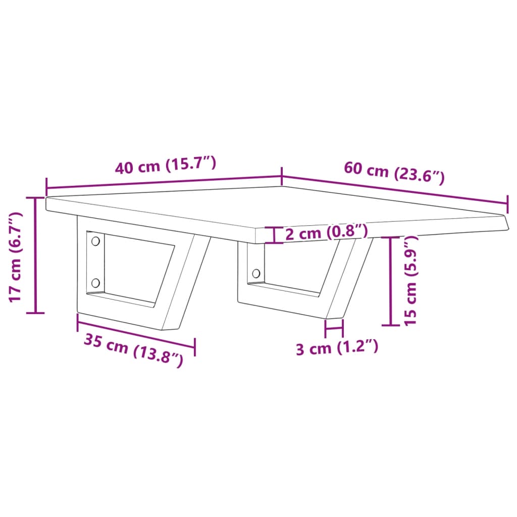 El estante de lavabo montado en la pared se fija de forma segura a la pared, proporcionando una solución elegante y que ahorra espacio para tu baño. Robusto y duradero: Este estante de lavabo se combina con una estructura de acero y una superficie de madera maciza de roble, lo que lo hace resistente, estable y duradero.Ahorro de espacio: El estante de lavabo flotante tiene un amplio espacio para almacenar cremas y artículos pequeños. Gracias a la forma trapezoidal, puedes colgar toallas u otras cosas en el soporte para ahorrar espacio.Fácil de usar: La encimera viene sin perforar para permitir que el lavabo se monte a la izquierda, a la derecha o en el centro, según los requisitos de la habitación. Gracias a los orificios pretaladrados en el soporte, se puede montar fácilmente con el tablero y montar en la pared.Diversos usos: Gracias a su diseño moderno, proporciona espacio adicional para varios tipos de baños. Información útil:Los tornillos no están incluidos, puedes comprar los tornillos por separado según la información que se proporciona a continuación.Fijación a la pared: 2 tornillos de expansión M8 por soporteTabla de madera: 2 tornillos M5x18 (T=2) o 2 tornillos M5x20 (T=2,5/4cm) por soporteAl ser un producto natural, la madera puede presentar nudos e imperfecciones que rellenamos con rellenos para garantizar un aspecto liso.