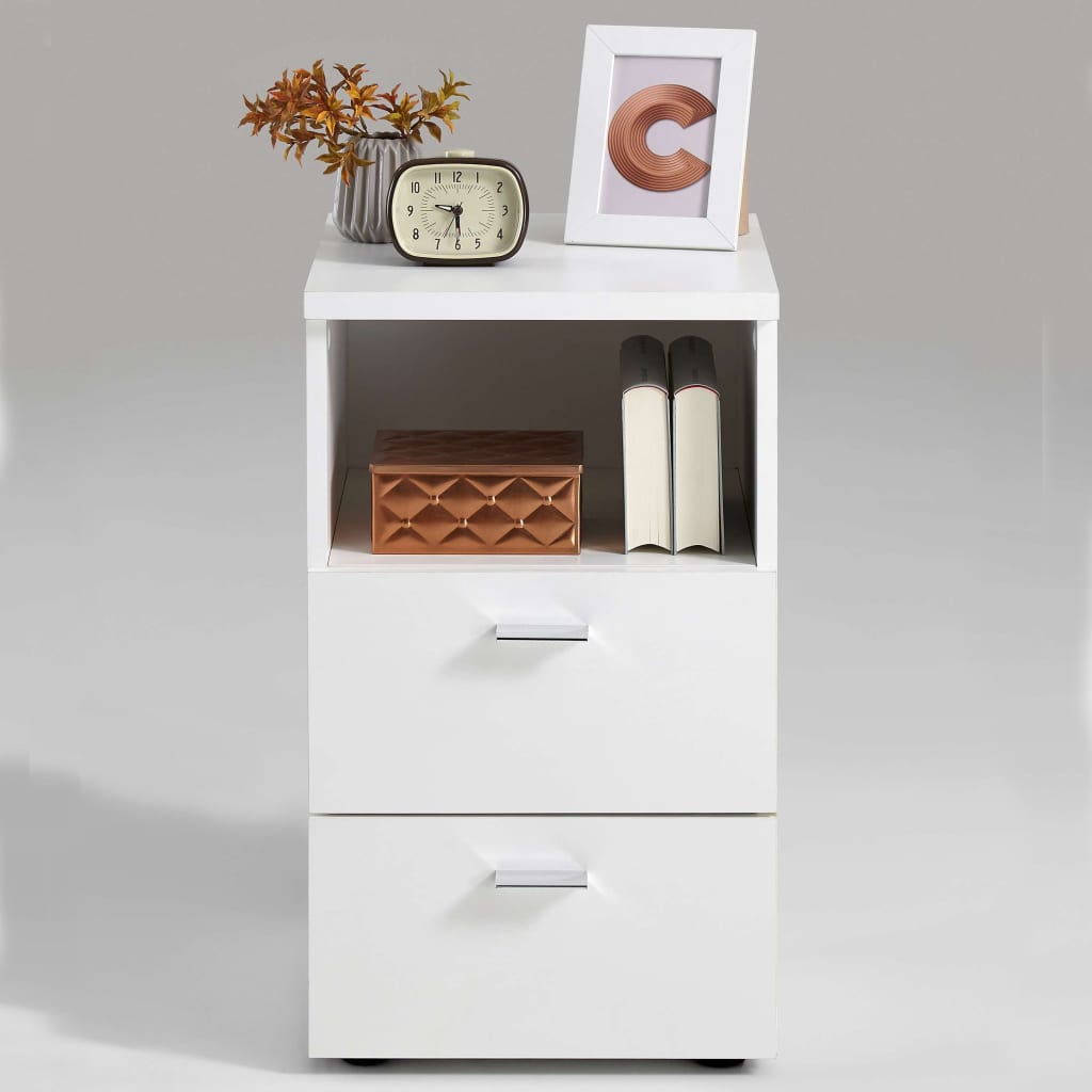 La moderna mesita de noche de FMD será un gran aporte para tu dormitorio. Tiene un diseño elegante y moderno con dos cajones y un estante que tienen un amplio espacio para cualquier cosa que desees tener a mano, mientras que puedes tener el reloj despertador, tu libro favorito y una refrescante bebida o agua en la parte superior. La duradera mesita de noche de la marca FMD está hecha de aglomerado cubierto de melamina en un discreto color blanco que se adapta a cualquier estilo interior.