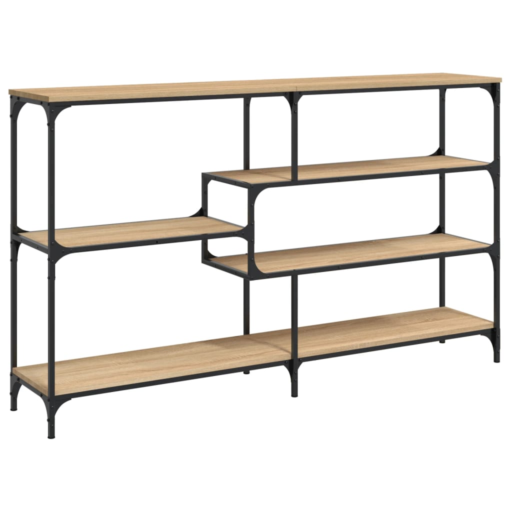 Añade un toque de elegancia a la entrada, el salón o el pasillo con esta elegante mesa consola. Material duradero: La madera de ingeniería tiene una calidad excepcional, con una superficie lisa, y también se caracteriza por su fuerza, estabilidad y resistencia a la humedad. Hecha de madera de ingeniería, la mesita de sofá es fácil de limpiar.Amplio espacio de almacenaje: La mesa de recibidor ofrece un amplio espacio de almacenaje para mantener bien organizados y al alcance revistas, libros, artículos decorativos y otros objetos de uso diario.Patas ajustables: La seis patas regulables, con tacos de plástico, mantienen equilibrada la mesa de pasillo en terrenos irregulares y aumentan su estabilidad.Estructura metálica: La estructura metálica añade un estilo industrial a la casa, además de garantizar su durabilidad y estabilidad. Advertencia:Para evitar que vuelque, este producto debe usarse con el dispositivo de fijación a la pared incluido.