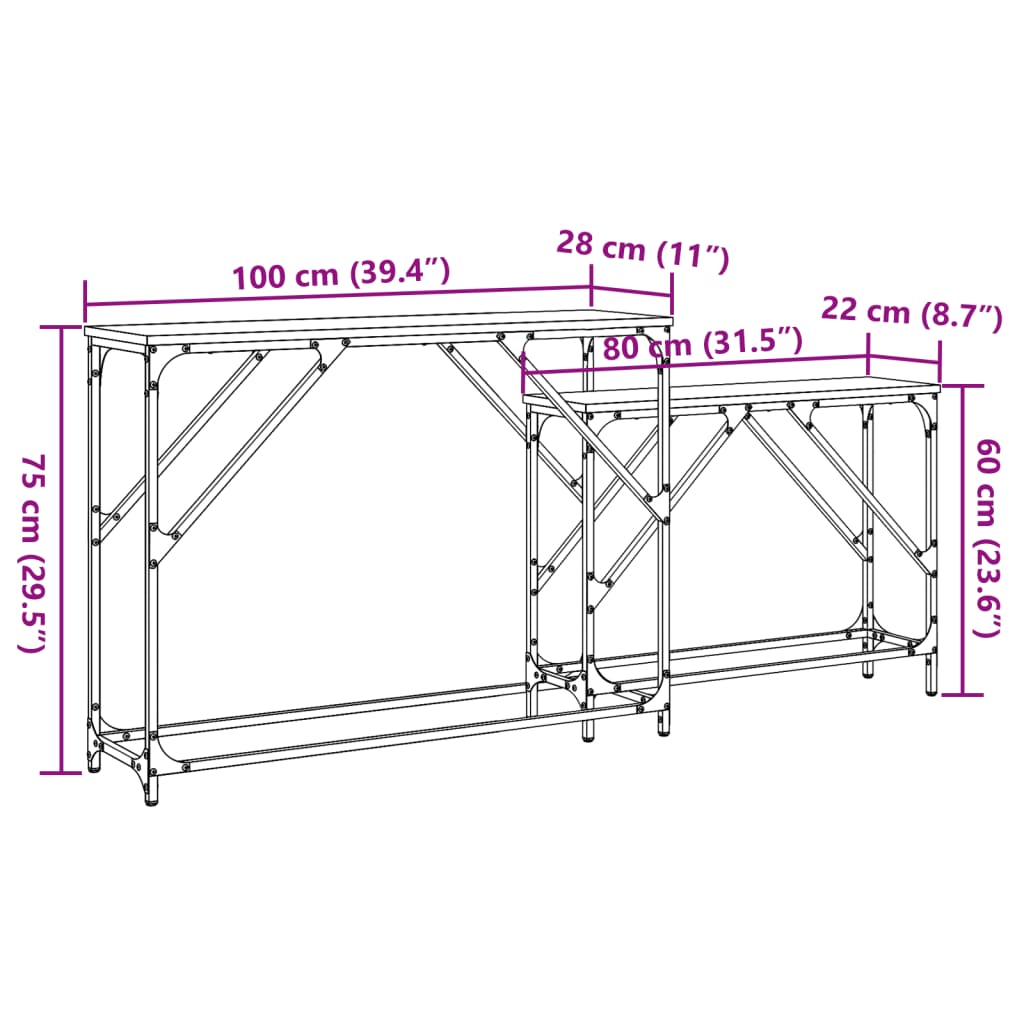 Añade un toque de elegancia a la entrada, el salón o el pasillo con estas elegantes mesas consola apilables. Material duradero: La madera contrachapada tiene una calidad excepcional, con una superficie lisa y también cuenta con fuerza, estabilidad y resistencia a la humedad. Hechas de madera contrachapada, las mesas apilables son fáciles de limpiar.Diseño apilable: Las mesitas apilables nido tienen diferentes tamaños para distintos propósitos. Si necesitas más espacio, las mesas más pequeñas caben dentro de la mesa consola más grande. Asimismo, puedes separarlas para ampliar la superficie.Superficie resistente: La resistente superficie de las mesas apilables es ideal para dejar las bebidas o cualquier otra cosa que necesites tener al alcance de la mano.Función versátil: Las mesas nido de recibidor son muy versátiles. Cualquiera de ellas se puede usar como mesa de centro o mesa de entrada en el salón y el despacho.Estructura metálica: La estructura metálica añade un estilo industrial a la casa, además de garantizar su durabilidad y estabilidad. Advertencia:Para evitar que vuelque, este producto debe usarse con el dispositivo de fijación a la pared incluido.