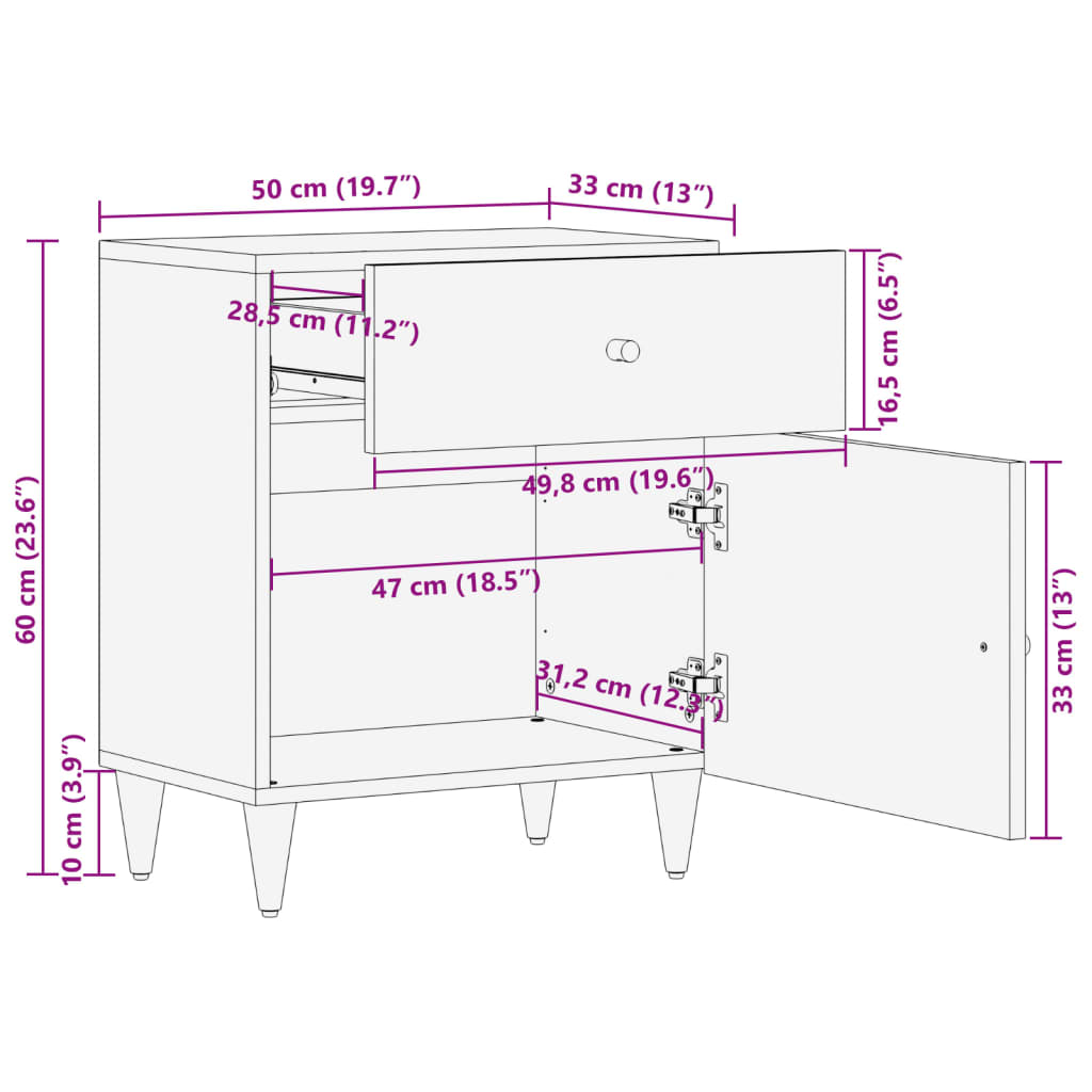 Esta mesita de noche, con un diseño elegante, es un aporte atemporal para la decoración de tu hogar. Madera maciza de mango: La madera maciza de mango es una madera dura, tropical y resistente, que sirve para fabricar muebles robustos. Las bonitas vetas de la madera hacen que cada mueble sea ligeramente diferente al resto. Hecho de madera maciza de mango, el mueble es duradero y estable.Amplio espacio de almacenamiento: La mesita de noche está diseñada con 1 cajón y 1 puerta para mantener las cosas organizadas y al alcance.Superficie estable: La superficie de este mueble auxiliar es perfecta para exponer objetos decorativos, marcos de fotos y plantas.Patas resistentes: Las patas de hierro aumentan la robustez y estabilidad de los muebles del dormitorio.Estilo retro: Esta mesita de noche con motivos florales tallados a mano aporta el lujo del estilo retro a tu decoración, siendo el foco de atención de tu habitación. Información útil:Cada artículo es único, con variaciones de color y veta. La entrega es aleatoria garantizando la exclusividad y la individualidad del producto. Advertencia:Para evitar que vuelque, este producto debe usarse con el dispositivo de fijación a la pared suministrado.