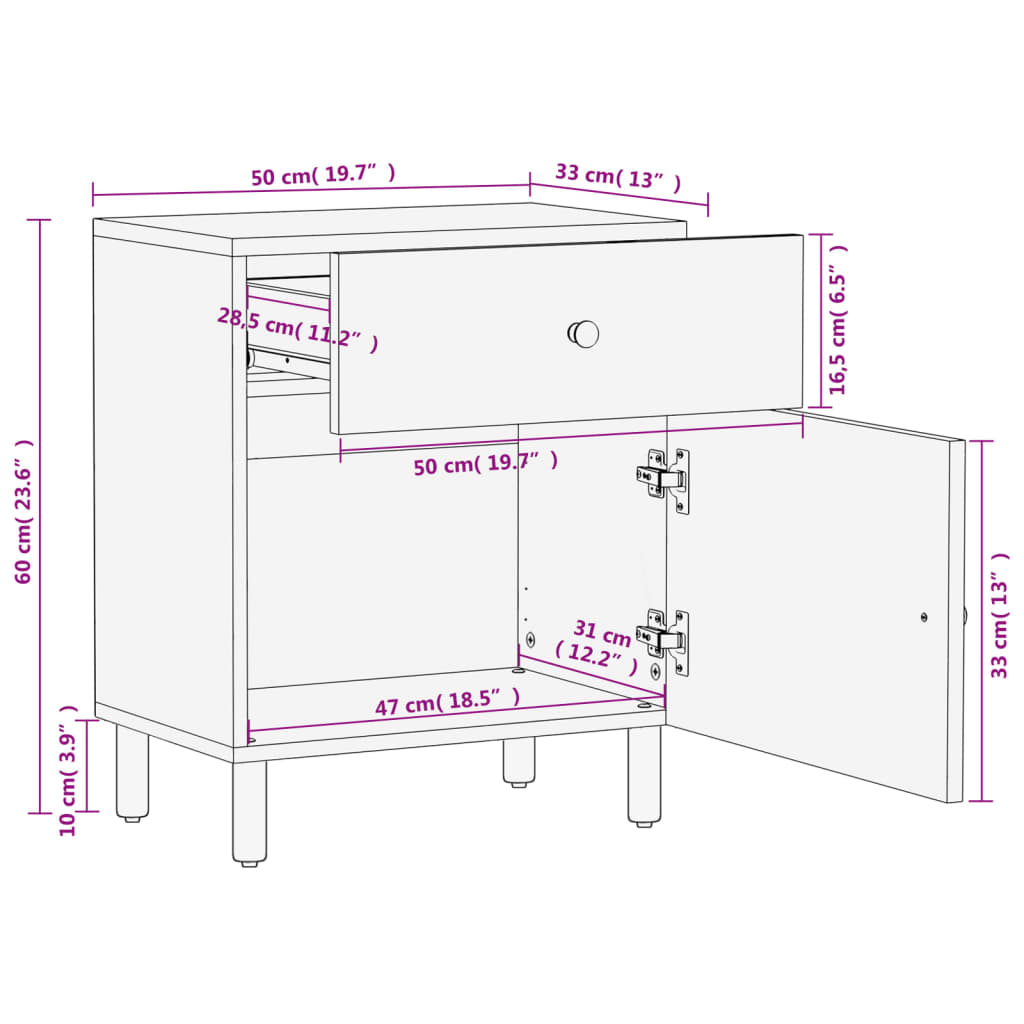 Esta mesita de noche, con un diseño elegante, es un aporte atemporal para la decoración de tu hogar. Madera maciza de mango: La madera maciza de mango es una madera dura, tropical y resistente, que sirve para fabricar muebles robustos. Las bonitas vetas de la madera hacen que cada mueble sea ligeramente diferente al resto. Hecho de madera maciza de mango, el mueble es duradero y estable.Amplio espacio de almacenamiento: La mesita de noche está diseñada con 1 cajón y 1 puerta para mantener las cosas organizadas y al alcance.Superficie estable: La superficie de este mueble auxiliar es perfecta para exponer objetos decorativos, marcos de fotos y plantas.Patas resistentes: Las patas de hierro aumentan la robustez y estabilidad de los muebles del dormitorio. Advertencia:Para evitar que vuelque, este producto debe usarse con el dispositivo de fijación a la pared suministrado.