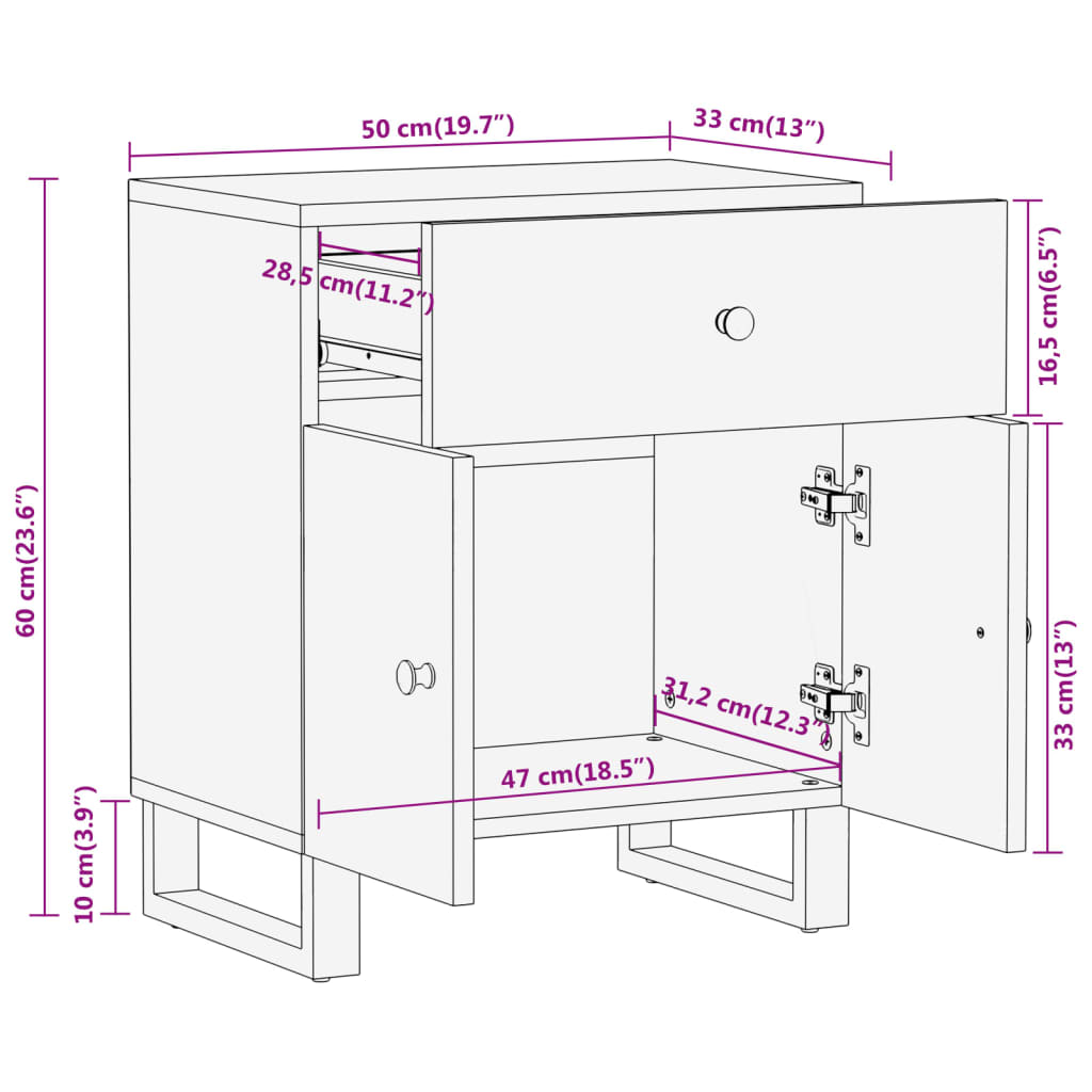 Esta mesita de noche, con un diseño elegante, es un aporte atemporal para la decoración de tu hogar. Madera maciza de mango: La madera maciza de mango es una madera dura, tropical y resistente, que sirve para fabricar muebles robustos. Las bonitas vetas de la madera hacen que cada mueble sea ligeramente diferente al resto. Hecho de madera maciza de mango, el mueble es duradero y estable.Amplio espacio de almacenamiento: La mesita de noche está diseñada con 1 cajón y 2 puertas para mantener las cosas organizadas y al alcance.Superficie estable: La superficie de este mueble auxiliar es perfecta para exponer objetos decorativos, marcos de fotos y plantas.Patas resistentes: Las patas de hierro aumentan la robustez y estabilidad de los muebles del dormitorio. Advertencia:Para evitar que vuelque, este producto debe usarse con el dispositivo de fijación a la pared incluido.